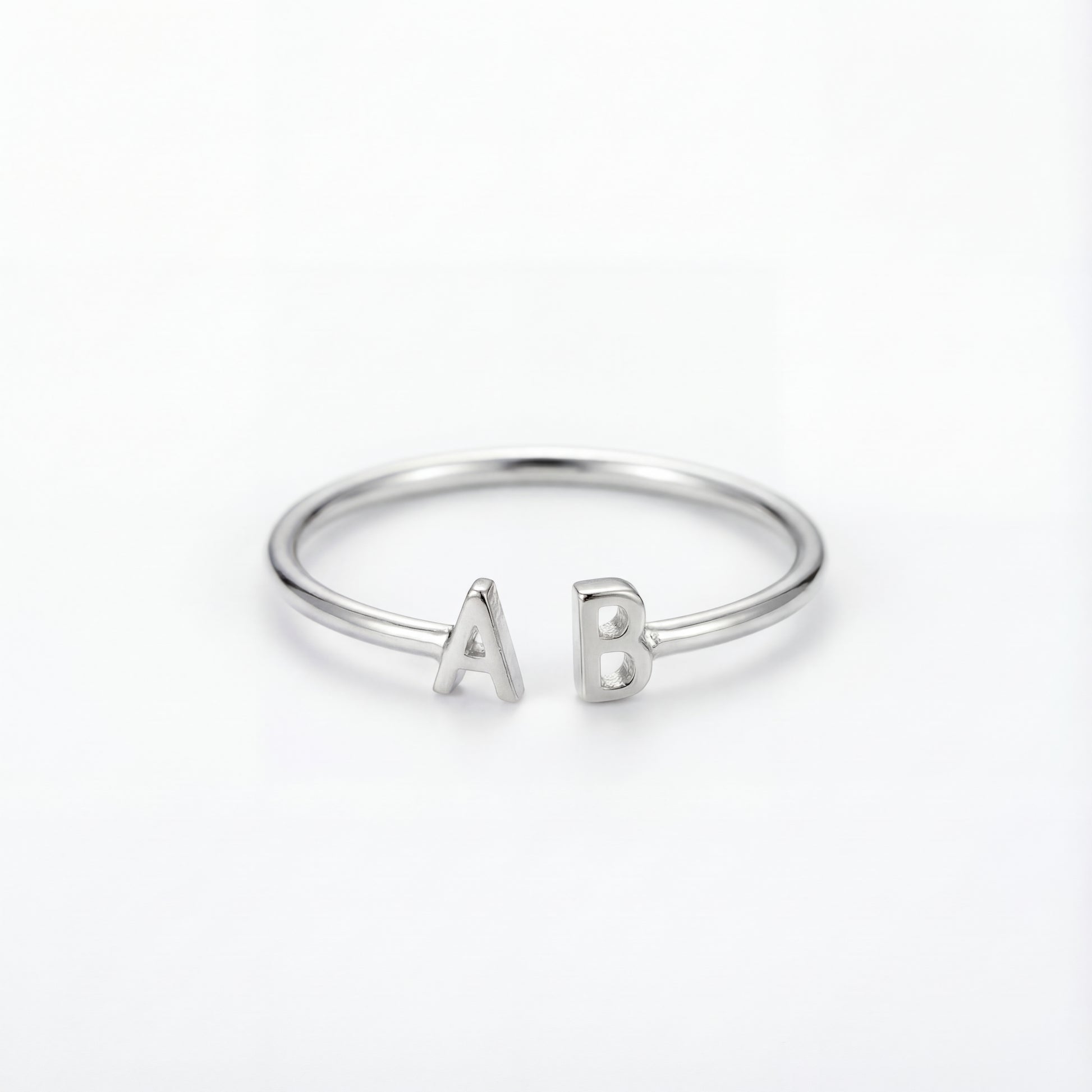 Este elegante anillo abierto presenta dos motivos de iniciales en extremos opuestos, creando una pieza personalizada y distintiva. El acabado cepillado y elegante añade sofisticación moderna.