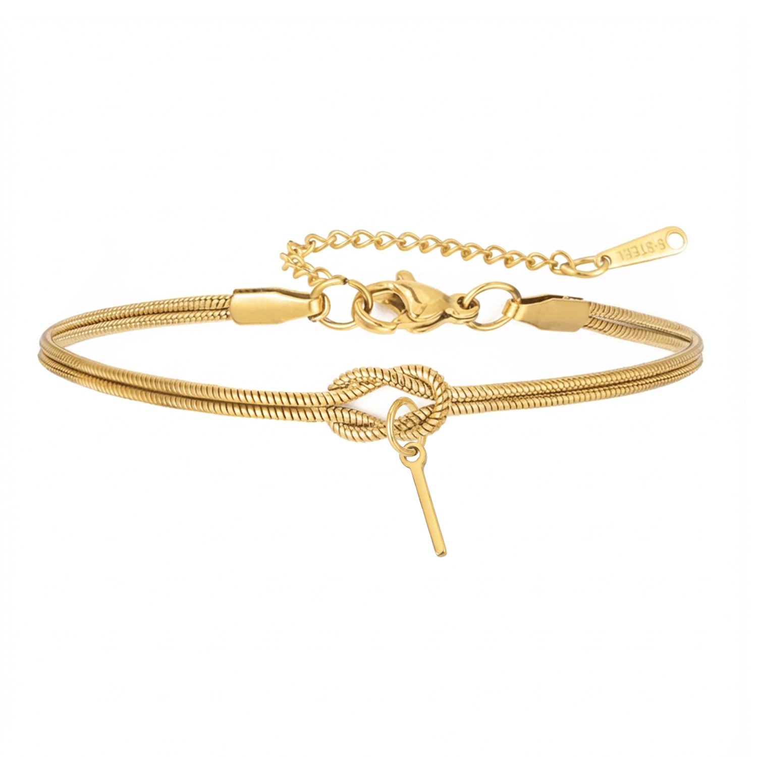 Un eslabón que eliges llevar todos los días. Esta pulsera delgada y contemporánea combina una elegante cadena de serpiente con un nudo simbólico, suspendiendo una inicial personalizada para encarnar un fuerte apego. Un detalle sutil que dice mucho: ya sea tu propia letra o la de un ser querido, sigue siendo precioso y cercano a ti.