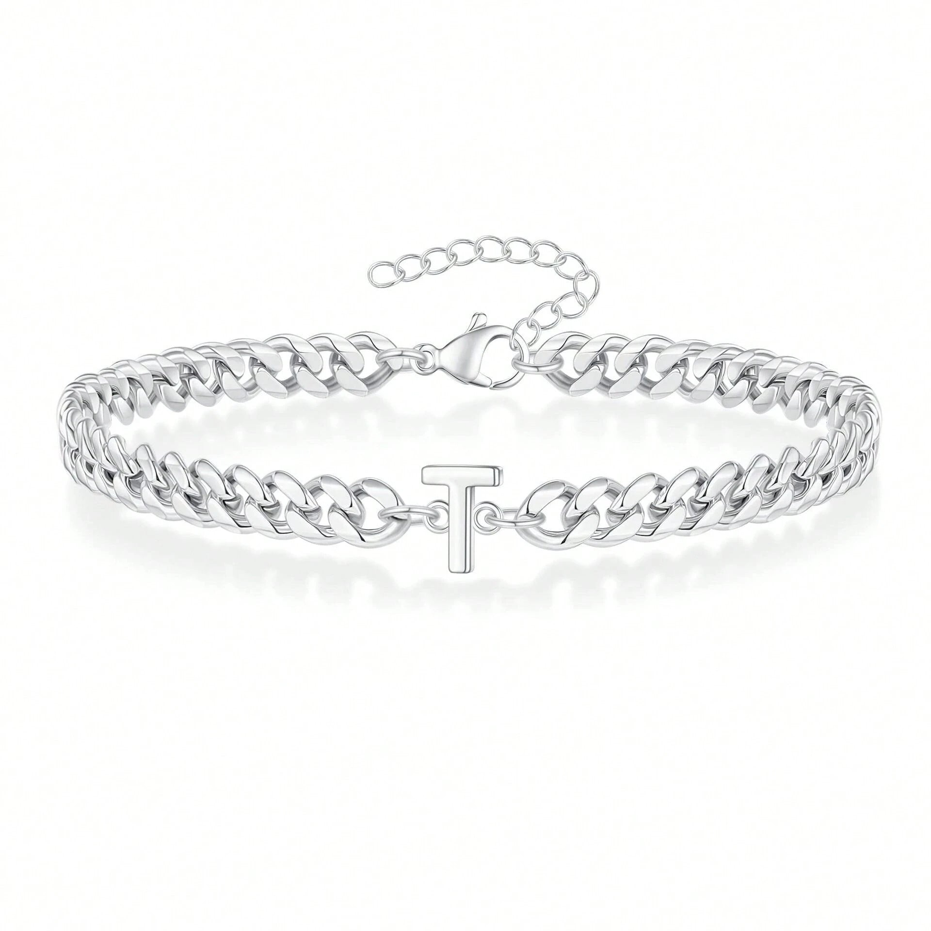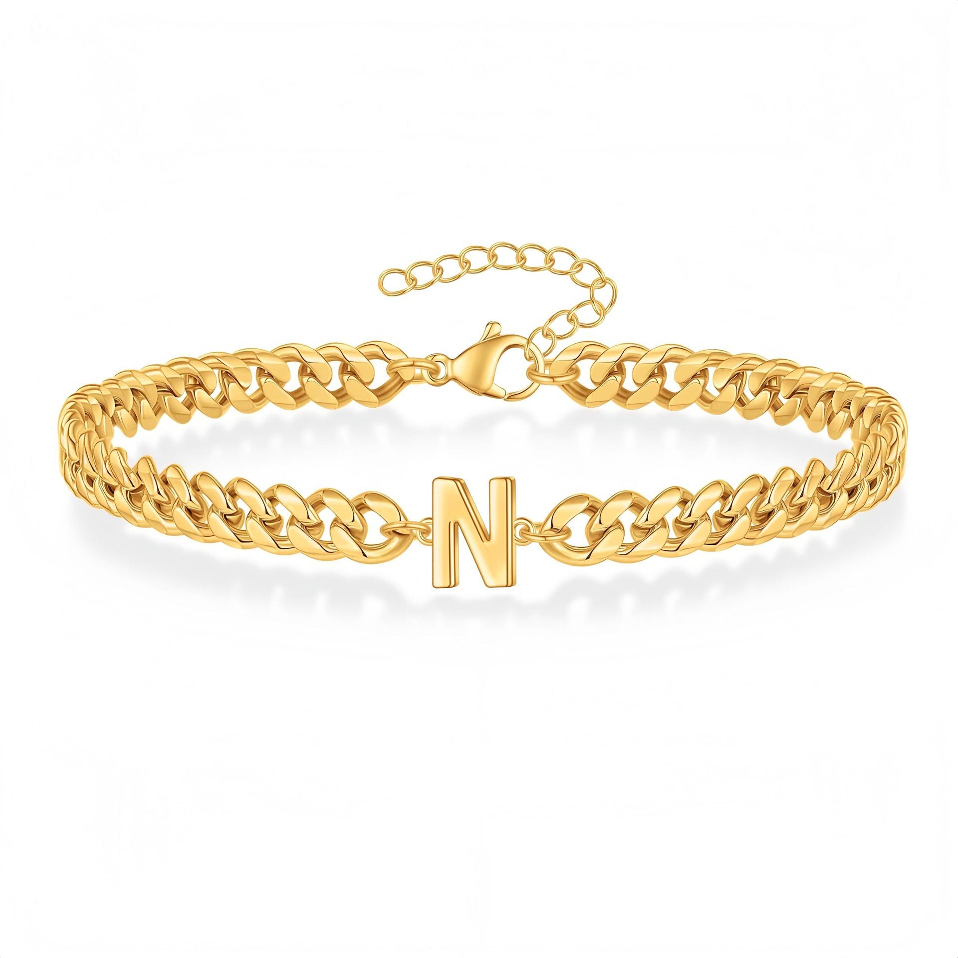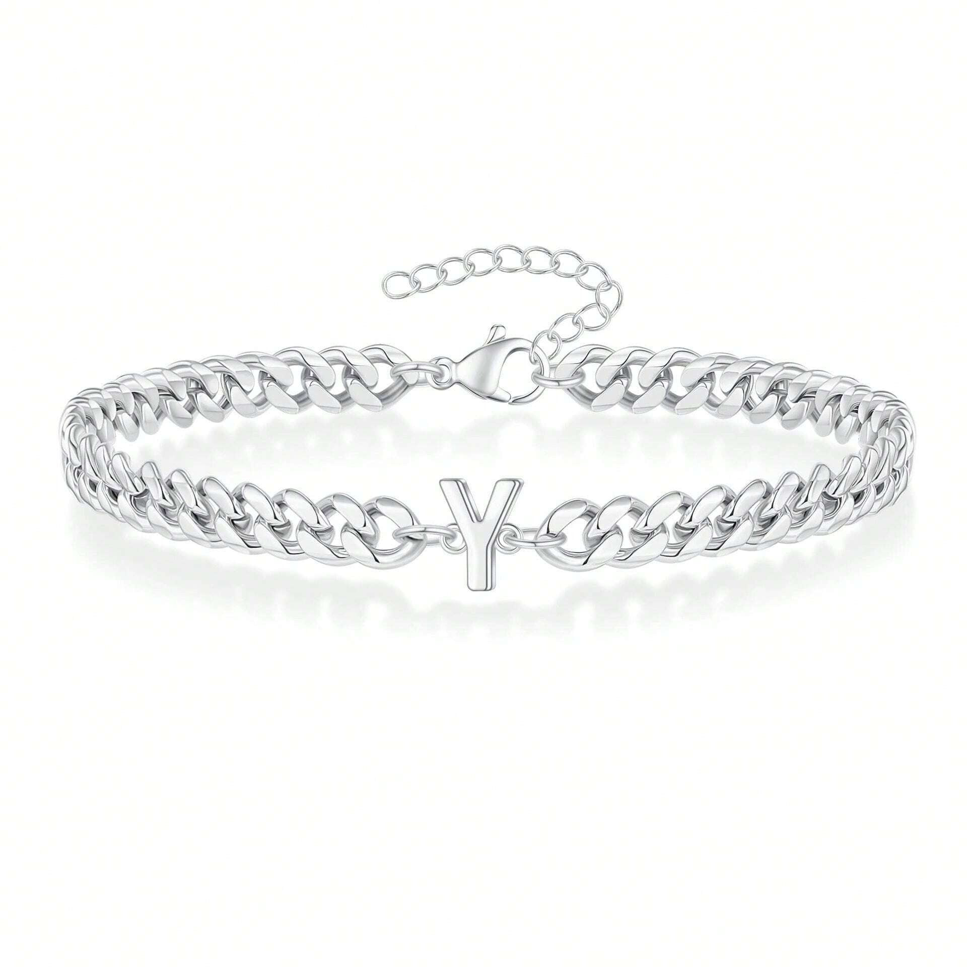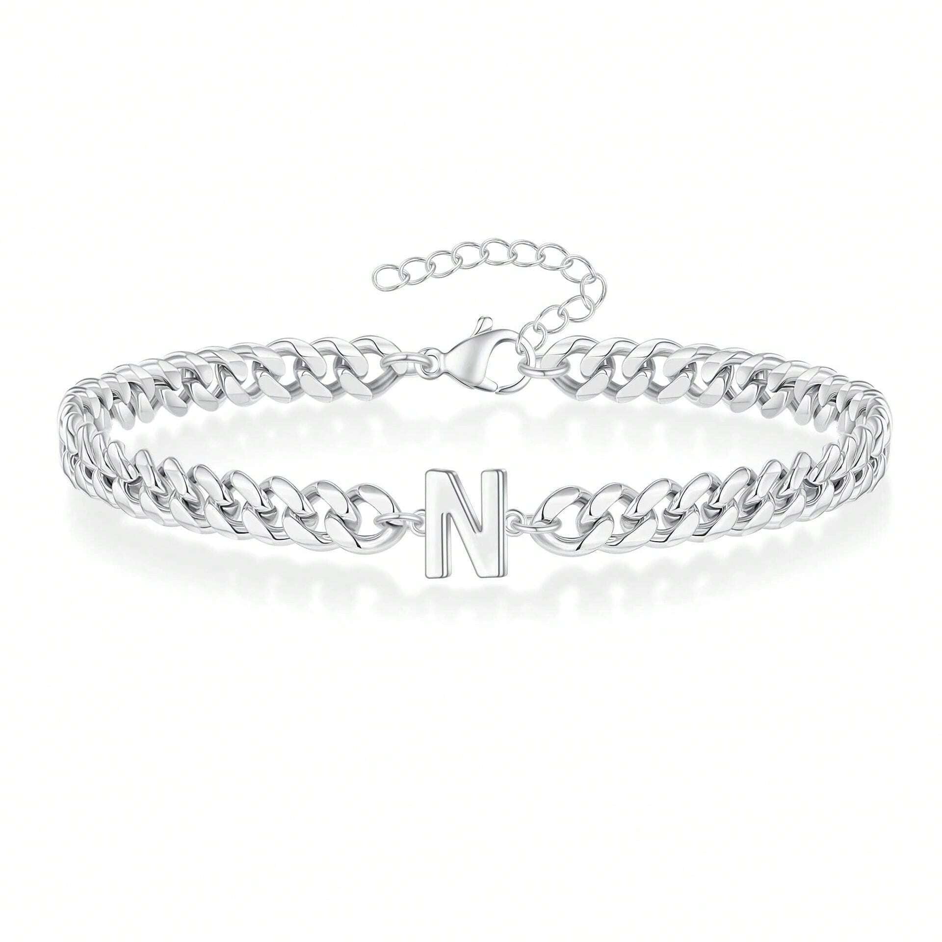 Una pulsera de cadena curb audaz con una inicial elegante en su centro. Su acabado pulido en oro/plata crea una pieza llamativa que es tanto elegante como personal.