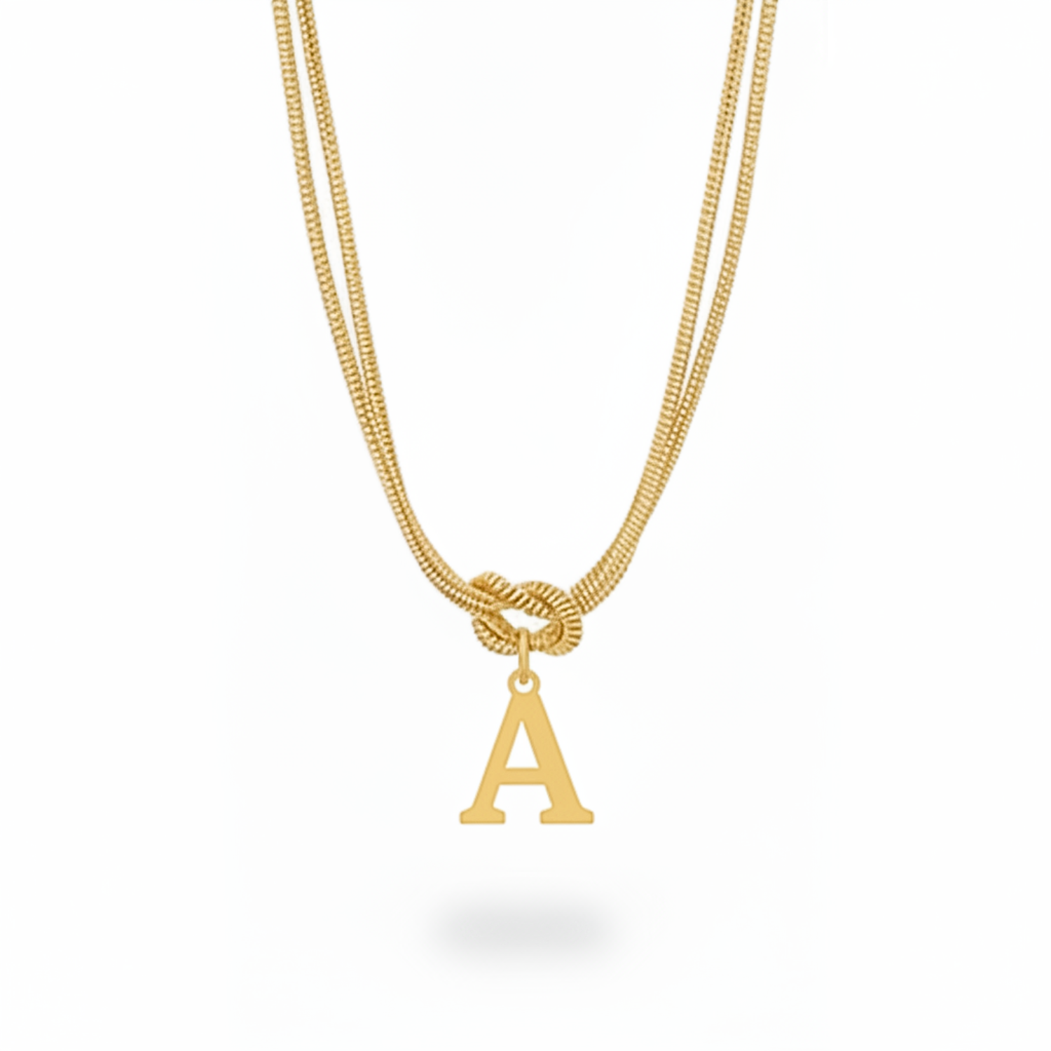 Un collar refinado de doble cadena con un elegante colgante de inicial suspendido de un sofisticado detalle anudado. El charm de letra pulida añade un toque personal a cualquier look.