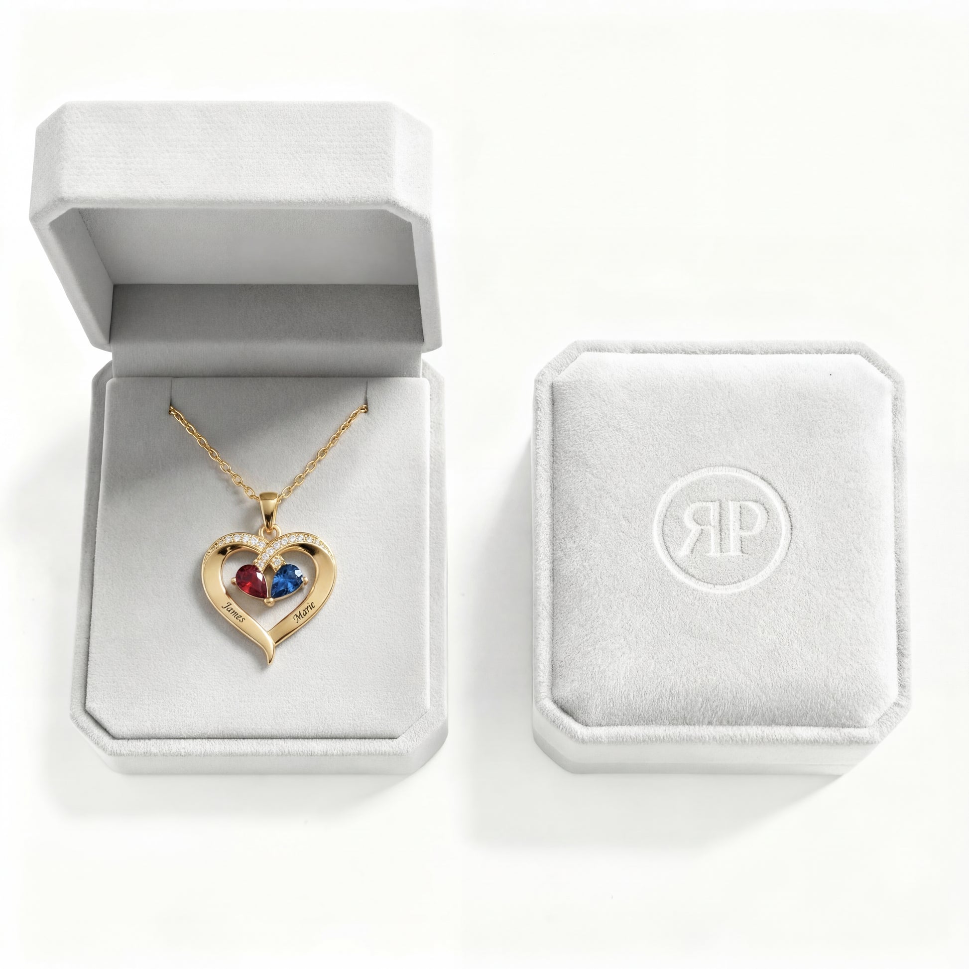 Un impresionante colgante de corazón dorado que presenta dos mitades de piedra de nacimiento unidas en el centro, adornadas con cristales brillantes a lo largo de la curva. Personalízalo con dos nombres de tu elección.