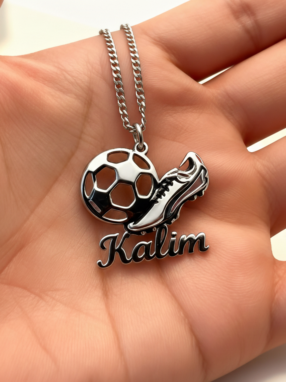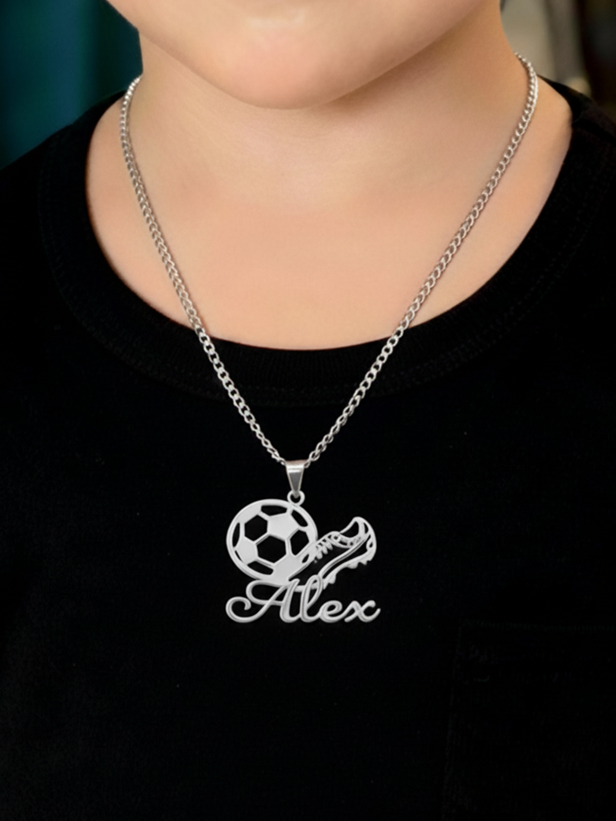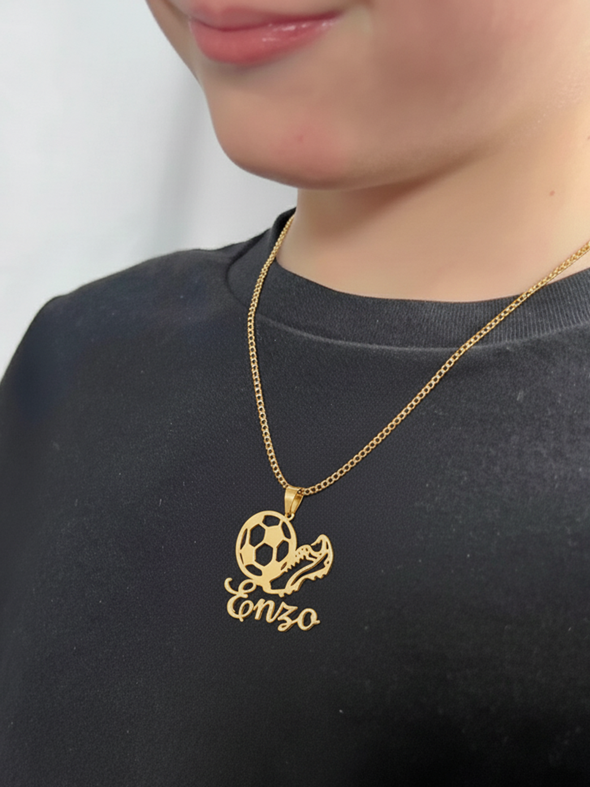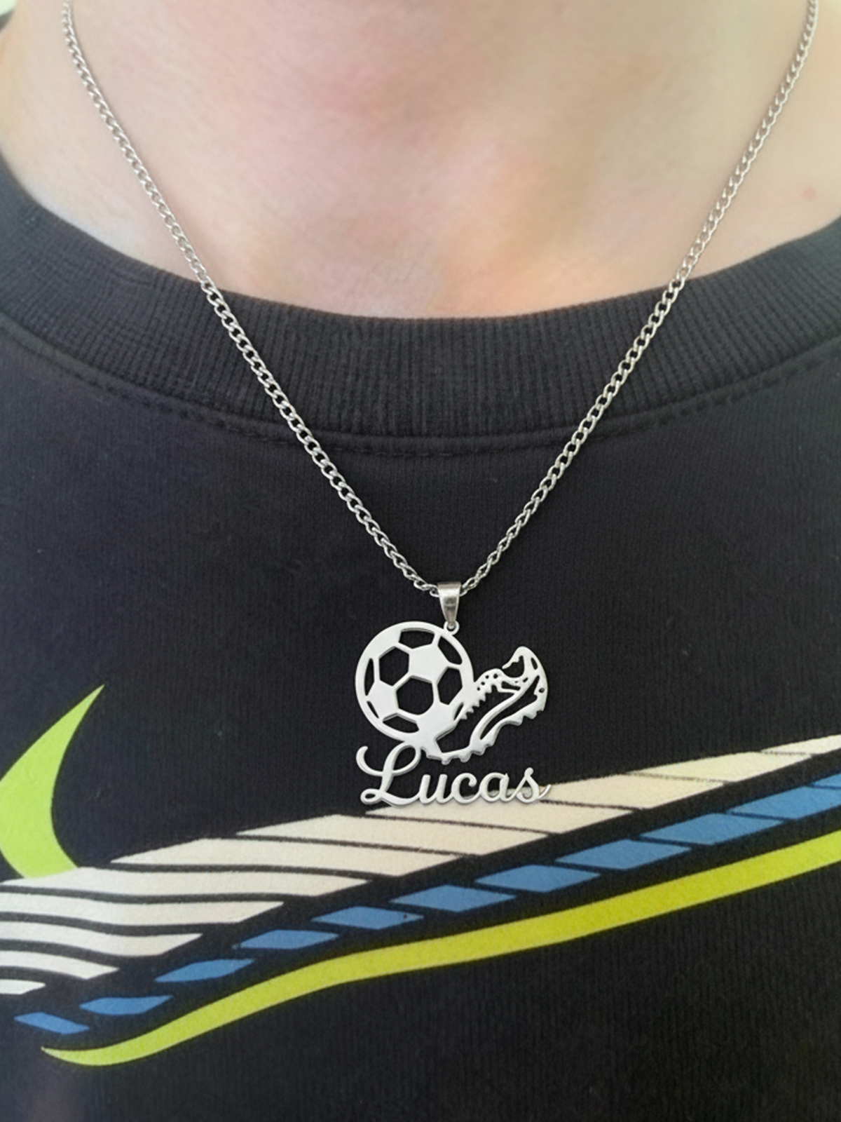 Para amantes del fútbol de todas las edades. Nuestro Collar Personalizado con Nombre de Fútbol presenta un diseño detallado de balón de fútbol y bota con grabado personalizado del nombre.