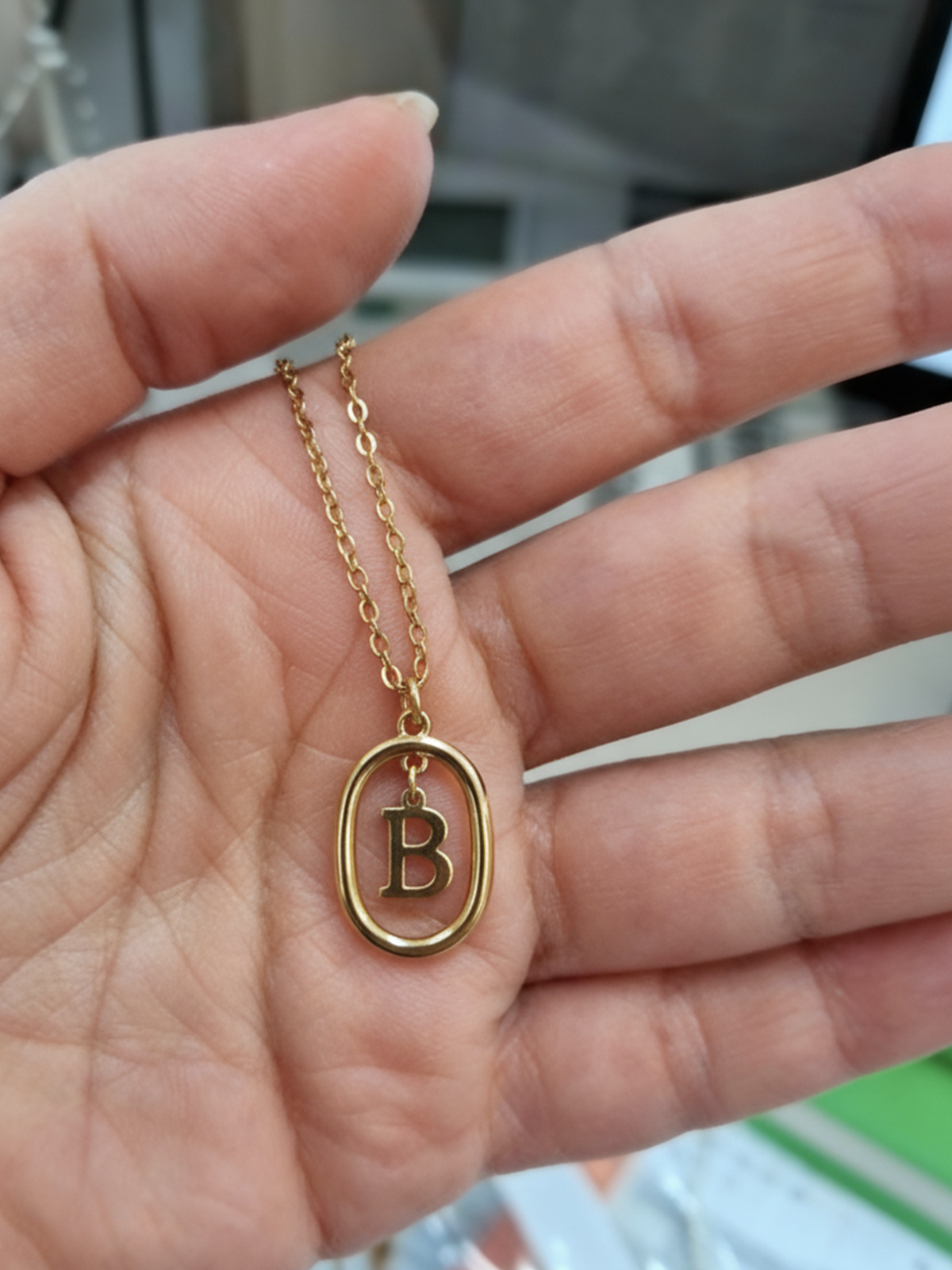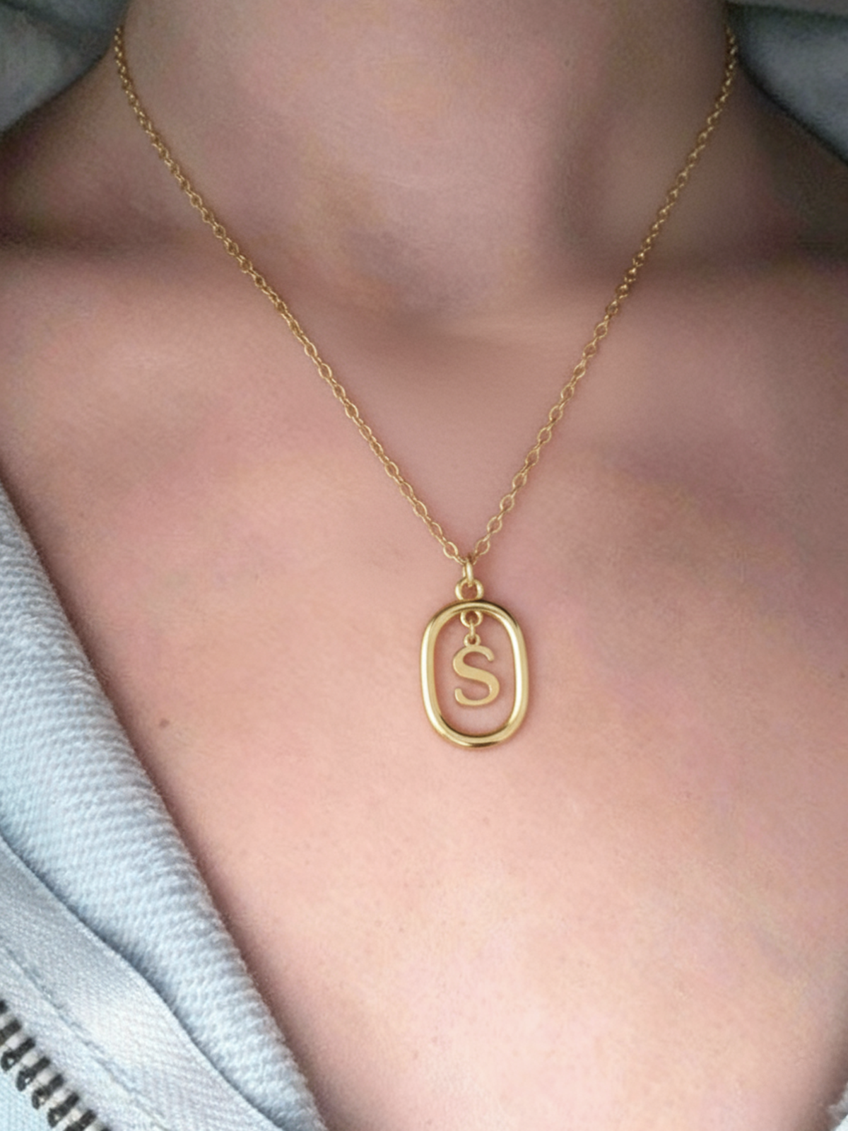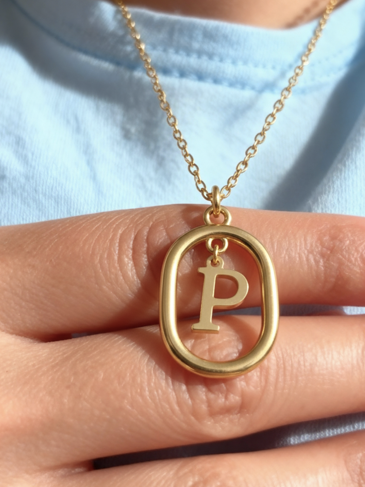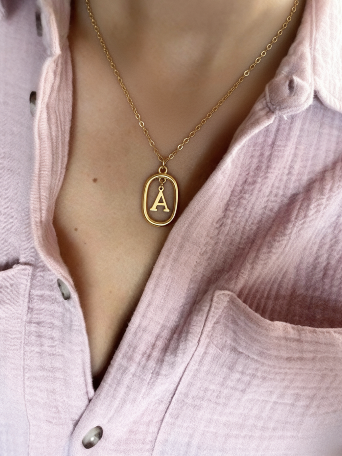 Exprésate con esta cadena de iniciales en oro, que presenta un diseño minimalista y refinado. Una letra suspendida en el centro de un óvalo liso, para un estilo moderno y personal.