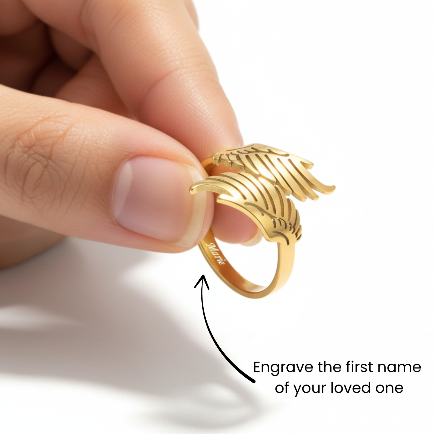 Con su elegante diseño de alas de ángel, este anillo personalizable es más que una joya, simboliza un vínculo eterno. Atemporal y ajustable, se adapta perfectamente a cualquier ocasión, ya sea que estés honrando un recuerdo precioso o expresando un amor duradero.