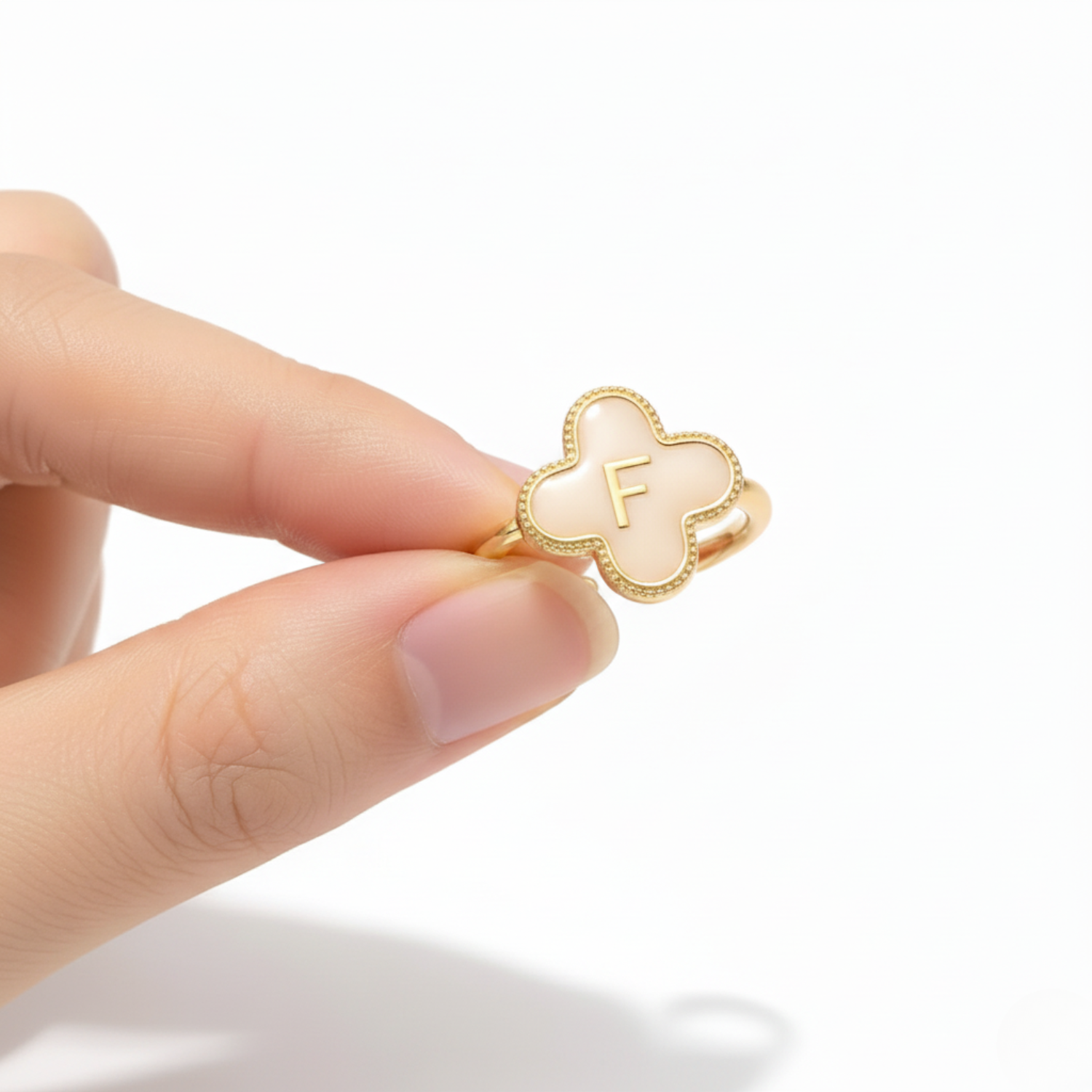 Expresa tu personalidad con elegancia gracias a nuestro anillo personalizado de trébol. Cada anillo presenta una inicial finamente grabada en el centro de un trébol dorado con un acabado perlado, un símbolo atemporal de suerte y felicidad. El diseño calado y la banda abierta ajustable lo hacen práctico y refinado, perfecto para adaptarse cómodamente a cualquier dedo con estilo.