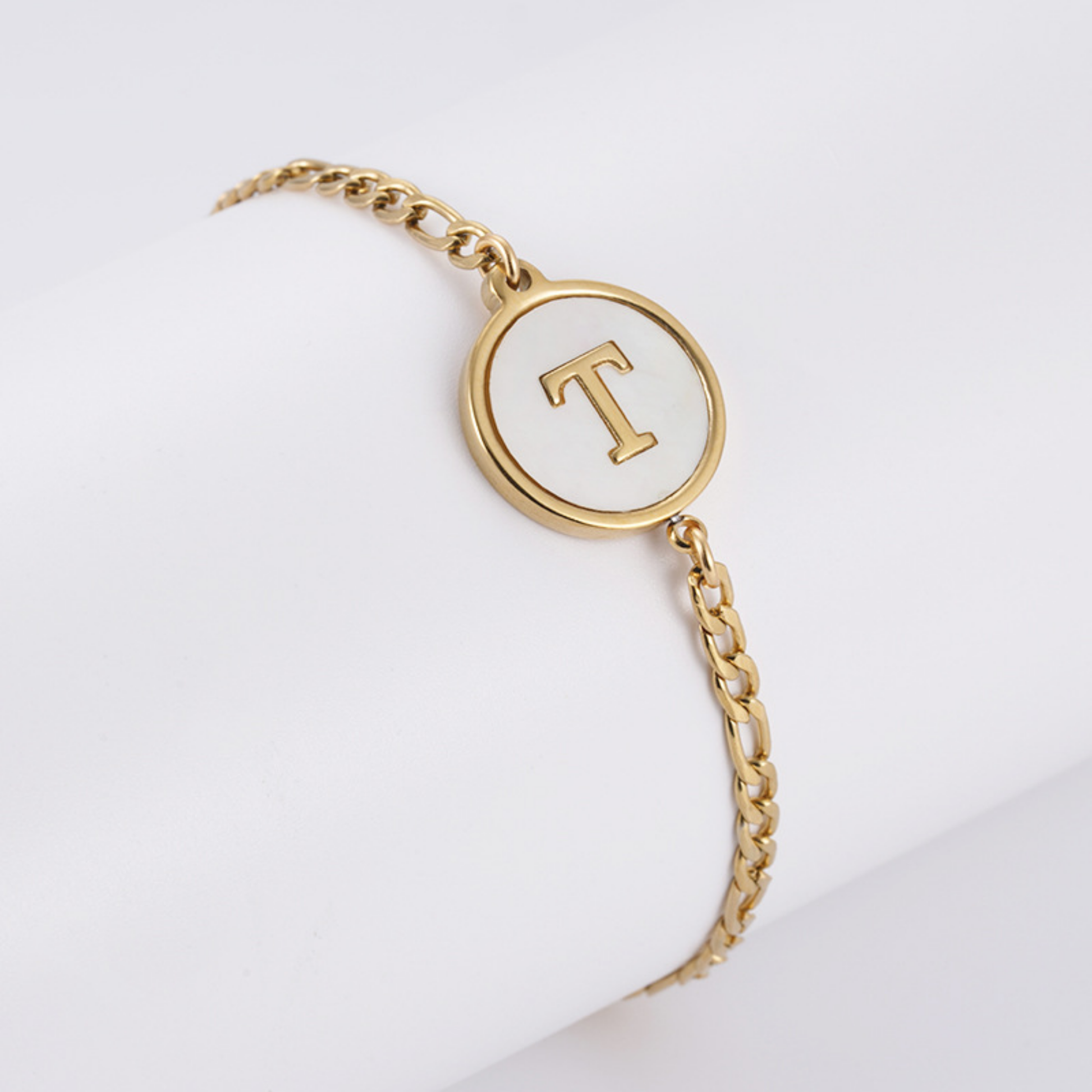 Regala (o date un capricho con) una pieza única de joyería con elegancia atemporal con esta pulsera medallón vintage personalizada. Su colgante redondo, disponible en blanco perlado o negro profundo, presenta una inicial dorada grabada en un estilo retro chic, realzada por una delicada cadena de eslabones dorada. Esta delicada pieza combina maravillosamente la modernidad y el encanto del viejo mundo para adornar cada muñeca con carácter y refinamiento.