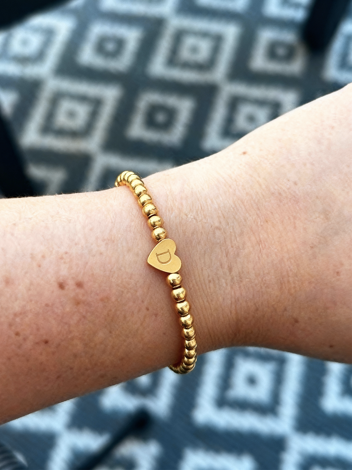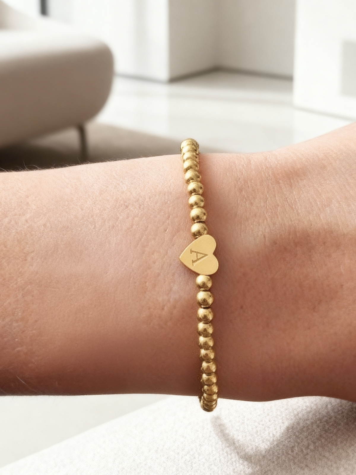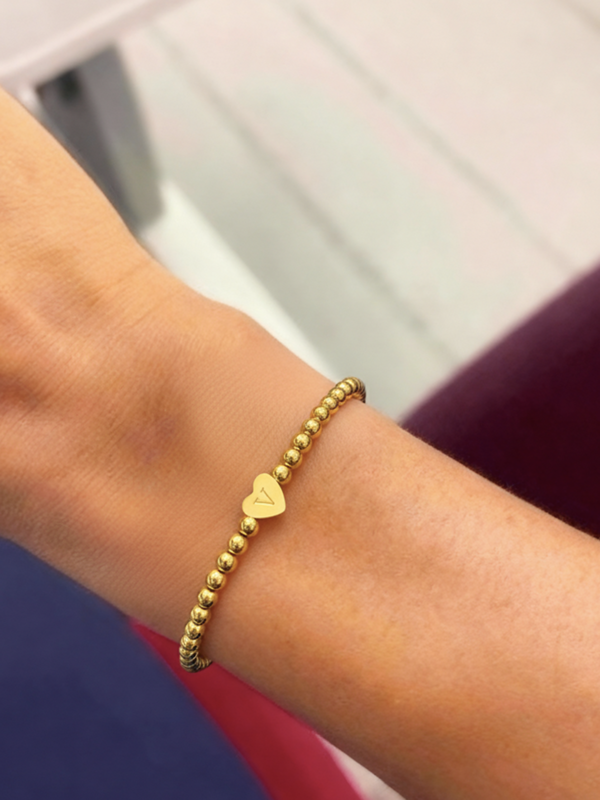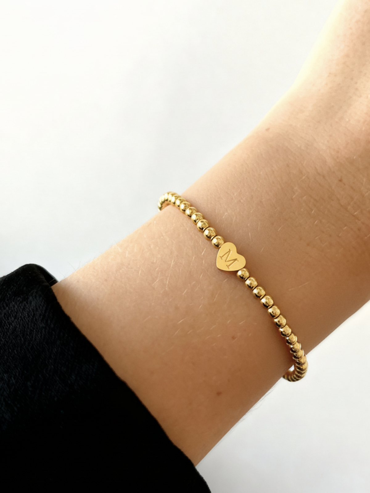 Esta pulsera refinada, hecha de cuentas en tono dorado o plateado, se realza con un pequeño corazón central grabado con la inicial que elijas. Simbolizando amor, familia o amistad, se adapta a todas las muñecas gracias a su diseño elástico y cómodo. Ya sea como regalo o un capricho para ti, esta pieza minimalista y chic encarna una conexión única.