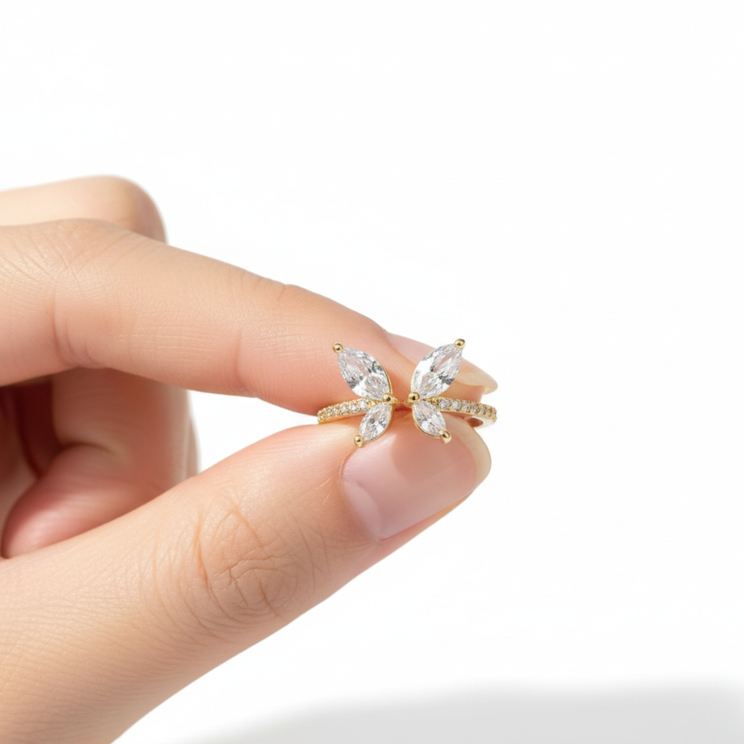 Elegancia en vuelo. Este anillo de mariposa captura la delicadeza de un momento suspendido, donde la belleza y la libertad se encuentran. Sus alas brillantes, adornadas con impresionantes cristales talla marquesa, parecen listas para cobrar vida con la más ligera brisa.