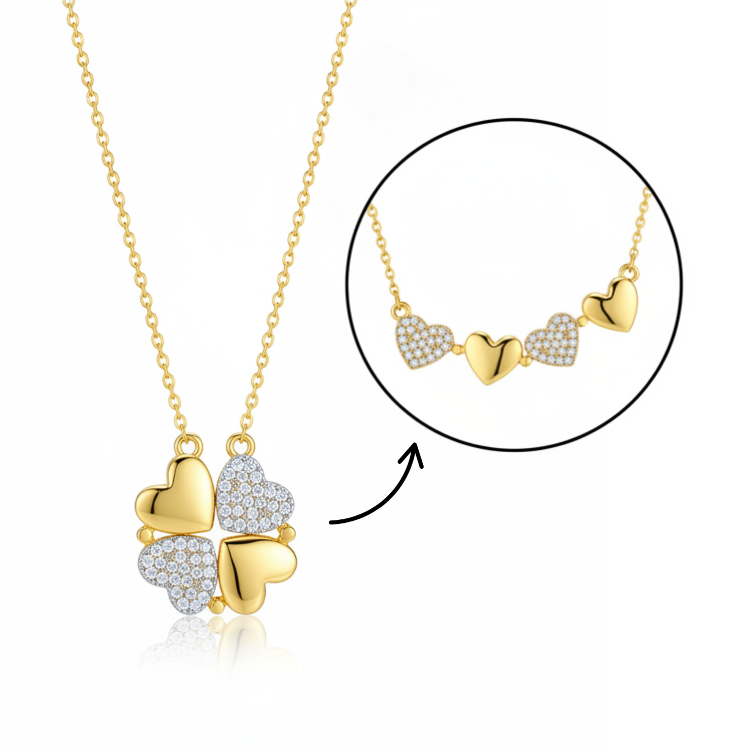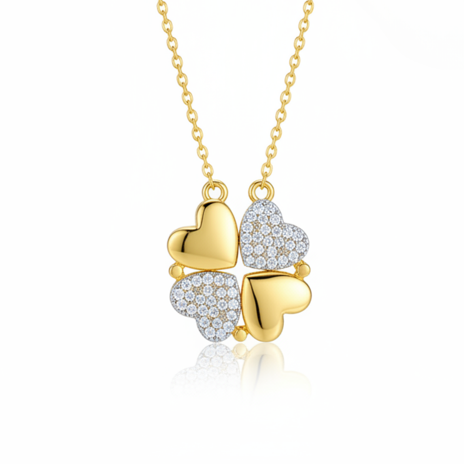 Este collar presenta cuatro corazones dorados, dos brillando con cristales, dos suavemente pulidos, que se unen para formar un delicado trébol de cuatro hojas. Un diseño ingenioso que combina romance y buena fortuna, creado para acompañar a quien lo lleva con gracia y significado.