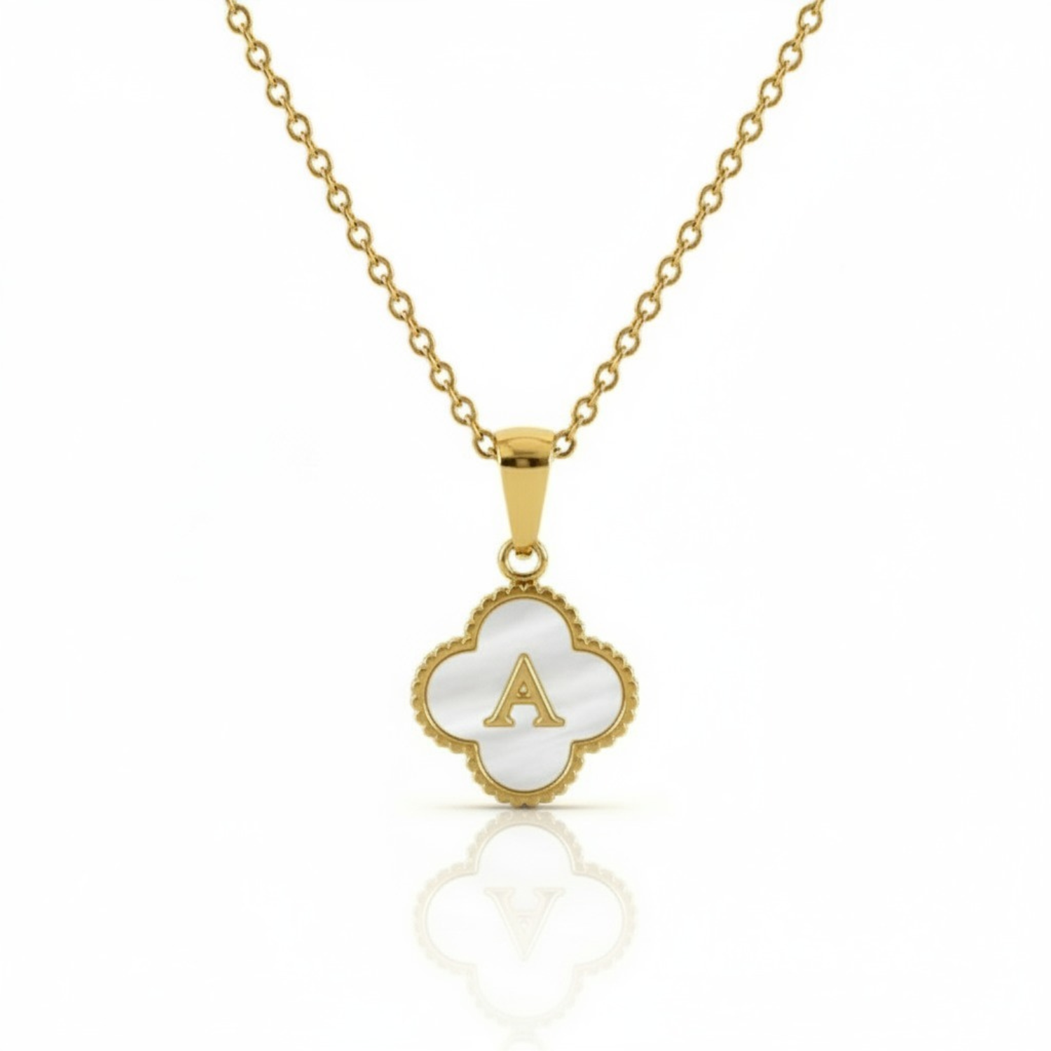 Este collar refinado combina elegancia y personalización en un diseño delicadamente inspirado en el trébol de cuatro hojas de la suerte. En su centro, una inicial de tu elección destaca orgullosamente sobre un fondo radiante de nácar, enmarcado por un engaste de oro cuidadosamente elaborado. Su colgante en forma de trébol de cuatro hojas simboliza la suerte, haciendo de esta pieza un regalo pensado o un amuleto personal de buena suerte.