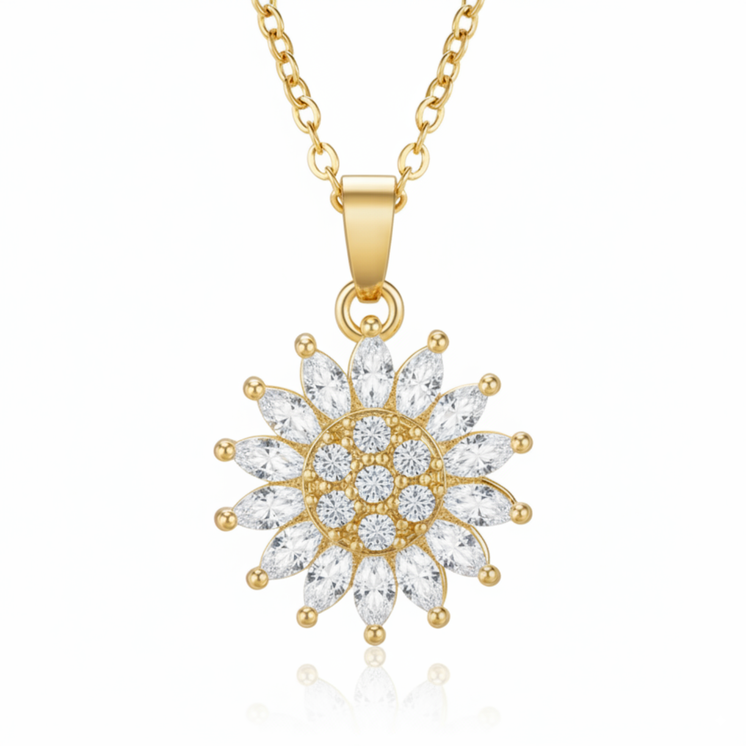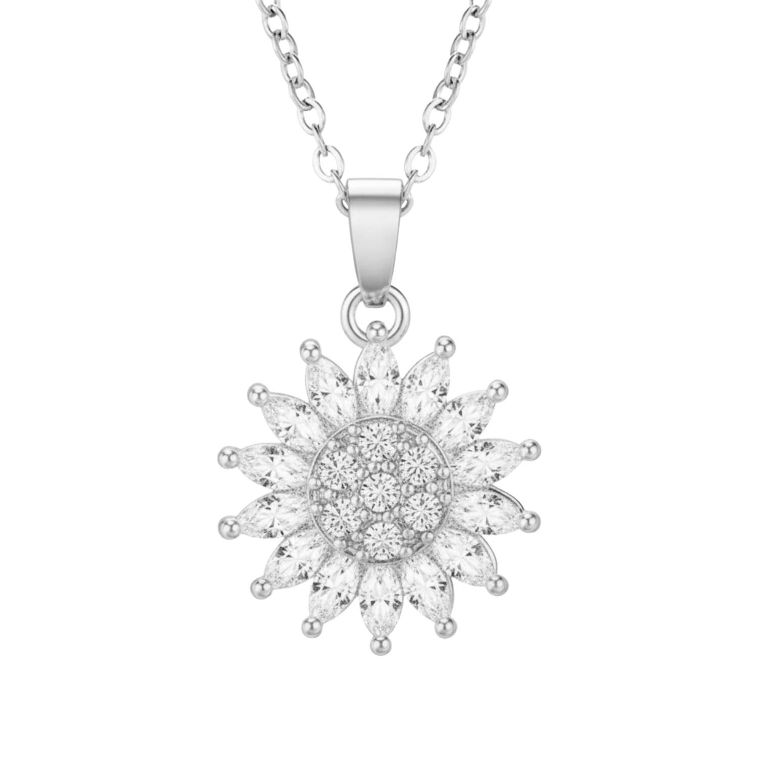 Brilla con belleza llevando este elegante collar con un colgante giratorio de girasol. Cada pétalo brillante está finamente engastado con circonitas centelleantes, captando la luz con cada movimiento. Gracias a su discreto mecanismo giratorio, el colgante puede girar sobre sí mismo, añadiendo un toque juguetón y hipnotizante a esta pieza refinada.